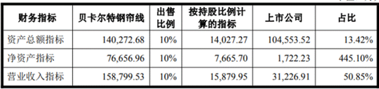 资料显示,贝卡尔特钢帘线主要从事胎圈钢丝、胶管钢丝等加固增强型钢丝产品,2024年实现营收15.88亿元。而同期法尔胜营收为3.12亿元,按10%持股比例计算,贝卡尔特钢帘线的营收占到法尔胜的50.85%。按相关规定,此次交易构成重大资产重组。